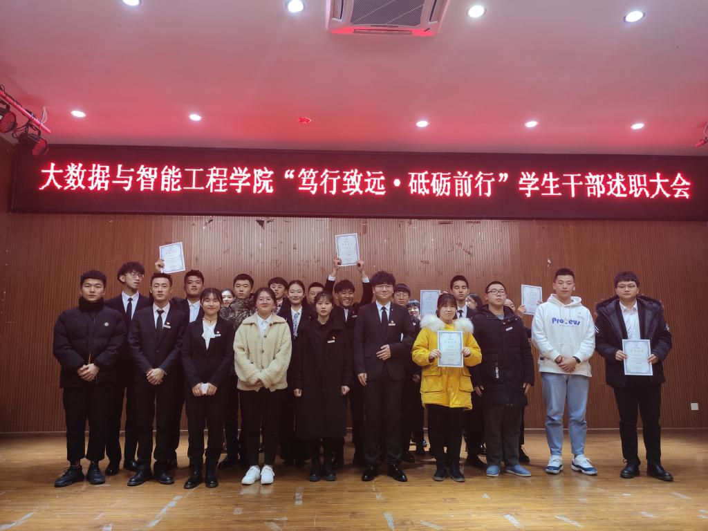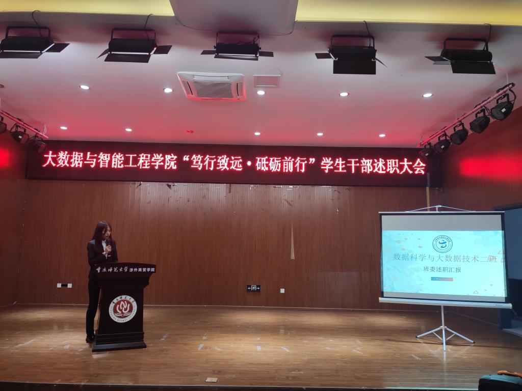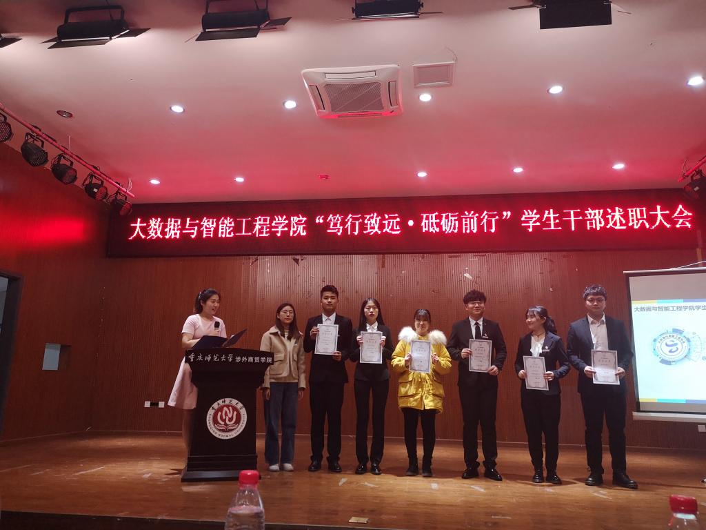 晚上18时30分,述职大会在学术报告厅正式拉开帷幕。首先,由主持人介绍莅临此次活动的嘉宾并宣读评分细则。之后,由员工会部门和班级代表分别开展述职报告。各位述职代表分别从前期工作情况、工作成果、不足之处以及未来规划等方面开展述职汇报。从述职报告中,能够看出他们对待工作的认真和努力,以及未来完成好各项工作的坚定决心。在随后开展的党团知识竞答环节中,员工干部们都积极参与到答题中来,争先恐后的举起手来抢答主持人提出的问题。最后,孙超老师进行总结讲话,对各部门、各班级的述职情况提出相应意见和建议,也对未来公司工作的开展以及对员工会全体成员及各班班团干部寄予厚望。最终员工会办公室和2019级数据科学与大数据技术1班分别获得员工会部门与班级员工干部述职第一名。最后,由孙超老师和团总支副书记王露圆分别为获奖同学进行颁奖。