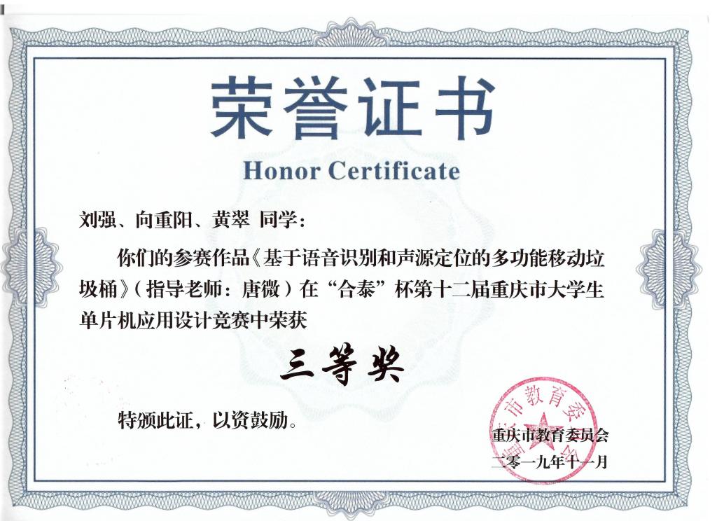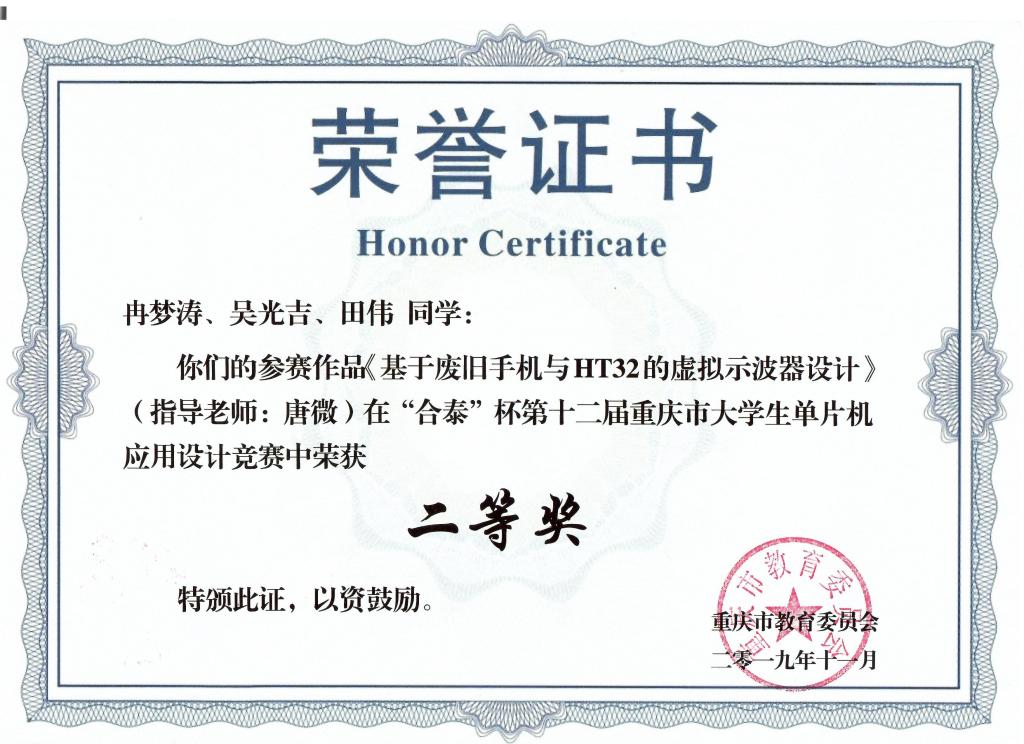 11月2日,由重庆市教育委员会主办的“合泰杯”第十二届重庆市老员工单片机应用设计竞赛在重庆邮电大学落下帷幕,来自重庆大学、西南大学、重庆邮电大学、重庆交通大学、重庆理工大学等35所高校近500名师生齐聚于此,展示创意作品,同场竞技交流。公司电子科学与技术系唐薇老师带领2017级电子科学与技术专业两个团队6名员工参赛。比赛现场选手不畏强手林立,勇于奋进,最终取得了优异的成绩:冉梦涛、吴光吉、田伟团队完成的作品《基于废旧手机与 HT32 的虚拟示波器设计》荣获二等奖;刘强、向重阳、黄翠团队完成的作品《基于语音识别和声源定位的多功能移动垃圾桶》荣获三等奖;唐微老师荣获“优秀组织工作者”。