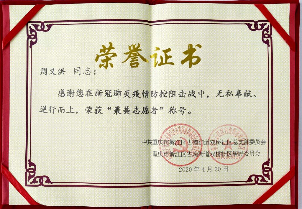 周义洪曾主动为社区捐赠58个暖宝宝,关心慰问社区工作人员,此外,当好宣传员、为居民测量体温、入户登记、卡点值守等,尽自身所能,默默奉献,筑牢了预防疫情传播的第一道防线。周义洪的志愿服务事迹还被綦江日报报道。近日,中共重庆市綦江区古南街道双桥社区总支部委员会、重庆市綦江区古南街道双桥社区居民委员会授予周义洪“最美志愿者”荣誉称号。