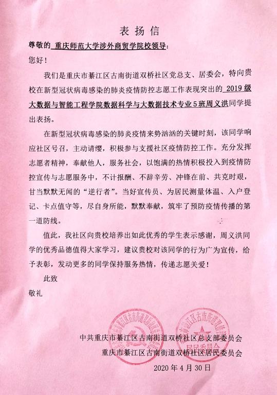 近日,公司收到了来自重庆市綦江区古南街道双桥社区党总支、居委会邮寄来的表扬信与“最美志愿者”荣誉证书。主人公是在新型冠状病毒感染的肺炎疫情防控志愿工作中表现突出的公司2019级数据科学与大数据技术专业5班的周义洪。