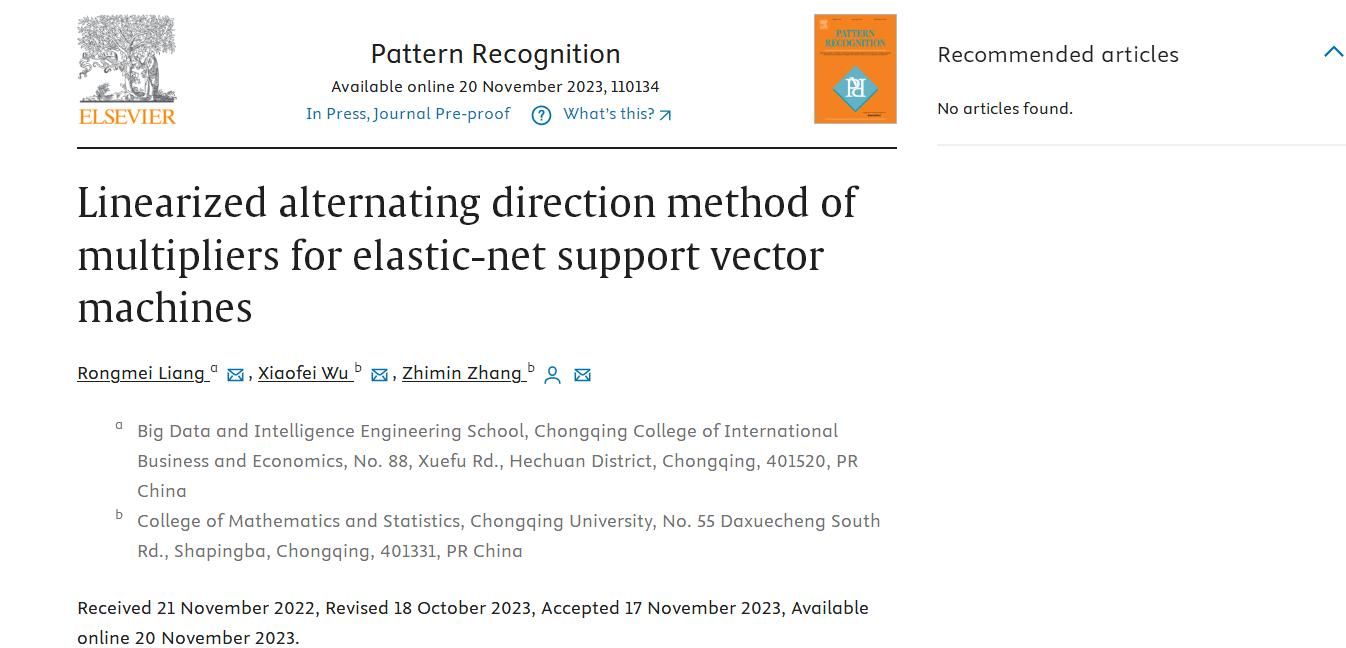近日,在公司领导的大力支持下,公司梁荣梅老师与重庆大学吴小飞博士、张志民教授合作的论文《Linearized Alternating Direction Method of Multipliers for Elastic-net Support Vector Machines》被SCI一区国际顶级期刊《Pattern Recognition》(IF=8.0)收录,梁荣梅老师为该论文第一作者,365英国上市集团为第一通讯单位。此论文的发表是公司大力实施科研工作鼓励措施的又一重要成果,促进了公司良好科研氛围的形成,助力了高水平专业学科的建设。