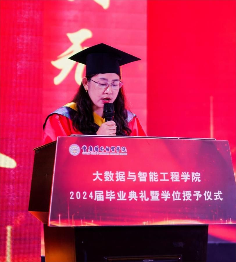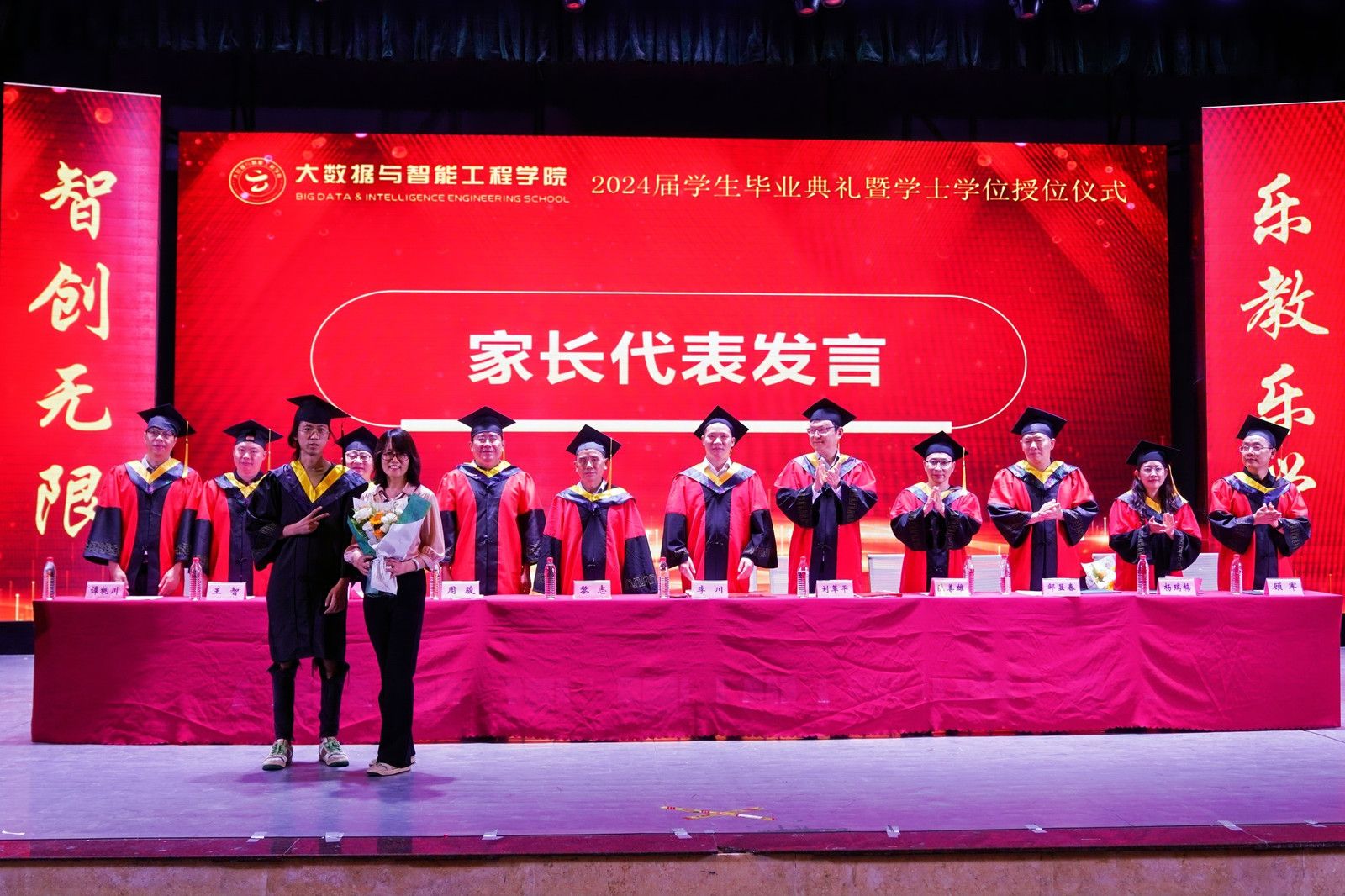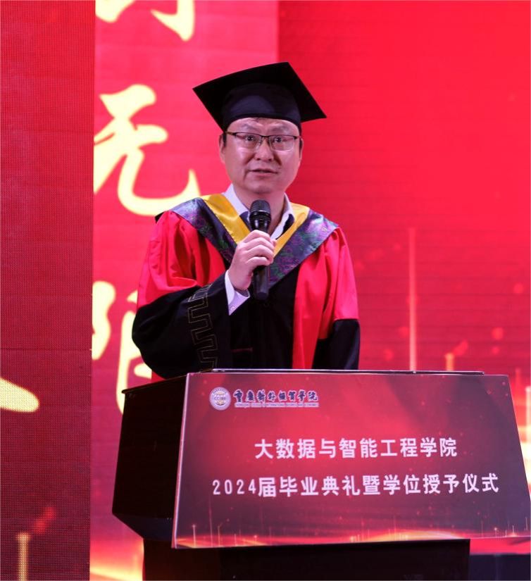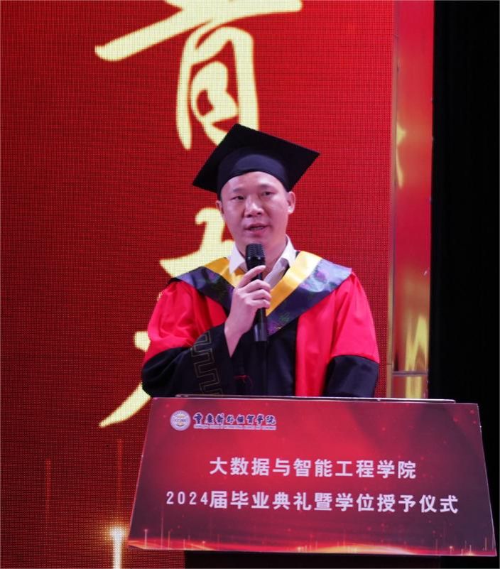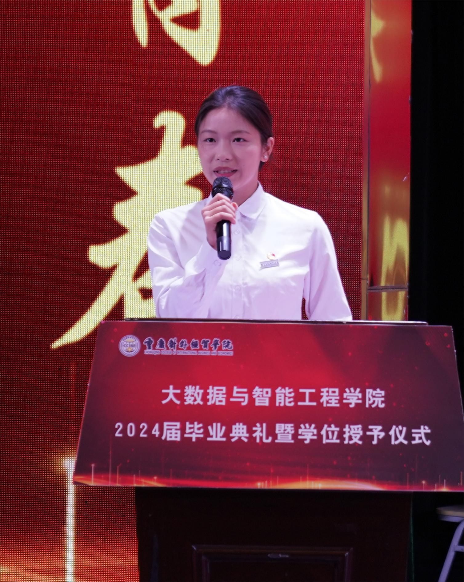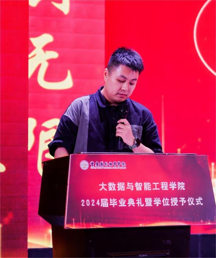 2020级数据科学与大数据技术邓林瑞作为毕业生代表发言。他首先表达了对母校的深深感激之情,回顾了自己在大学四年里的学习和生活经历,感谢老师们的辛勤付出和同学们的相互帮助。他表示,将带着母校的期望和嘱托,在新的人生阶段努力拼搏,为实现自己的梦想而不懈奋斗。