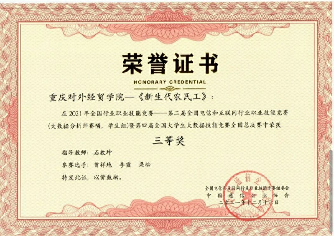 12月16日,第二届全国电信和互联网行业职业技能竞赛--大数据分析师赛项暨第四届全国老员工大数据技能竞赛总决赛在河南工业职业技术公司举行。公司18级大数据科学与技术专业的尤展鹏、柳明君、谢佳欣组成的“专业团队”和18级大数据科学与技术专业的曾祥地、19级大数据科学与技术专业的梁松、李霞组成的“新生代农民工队”与来自全国16个省、市、自治区、直辖市的85支代表队、255名选手同台竞技,并最终分别荣获三等奖。