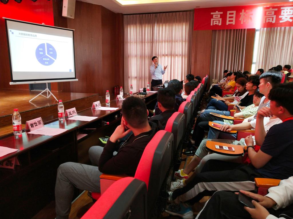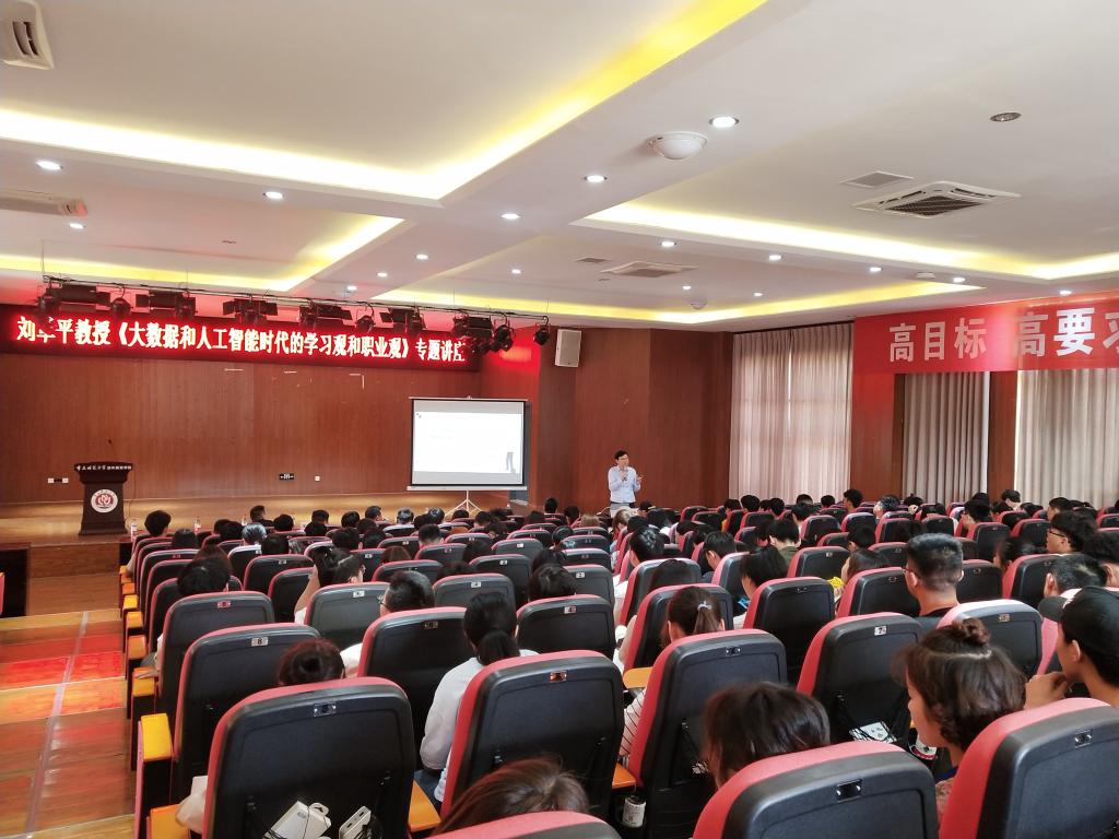 刘革平教授身兼西南大学教育技术学专业学科带头人、西南大学智慧教育研究中心主任、智慧教育重庆市高校工程研究中心主任、重庆市高等教育学会教育技术专业委员会理事长、中国高等教育学会教育信息化分会副理事长、中国教育技术协会理事等多个职务,并于2019年3月13日被正式聘任为公司经理。刘革平教授结合丰富的经验,围绕新一代信息技术的发展、新技术带来的挑战、大数据和人工智能时代的学习及大数据和人工智能时代的职业规划四个方面进行讲解,同时现场发起“大学毕业后,我想从事的工作”和“即将消失的职业”等多个问题的互动,与师生们近距离接触与探讨。