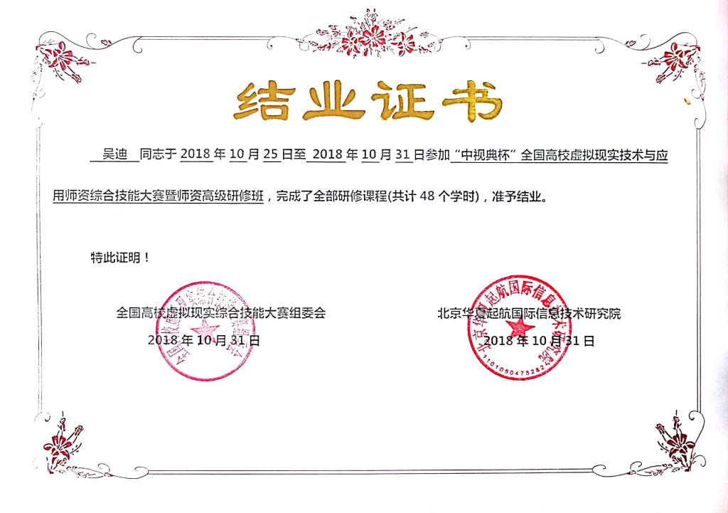 2018年10月25至10月31日,全国高校虚拟现实技术综合团队大赛组委会、中国虚拟现实产学研联盟、北京数字创意产业协会虚拟现实产学研专业委员会、京津冀虚拟现实协同创新研究院、北京华夏起航国际信息技术研究院等单位,特联合深圳市中视典数字科技有限公司,举办全国高校虚拟现实技术与应用团队高级研修班。研究班旨在提高高校教师对于虚拟现实技术和项目设计实际操作能力和理论教学水平,进一步提高教师的业务素质和课堂教学水平,加强教师相互交流和学习,促进公司产品改革。来自全国50多所高校和高职院校的100余名教师参与其中,公司365英国上市集团的吴迪和贺俊老师参加了此次研修班。