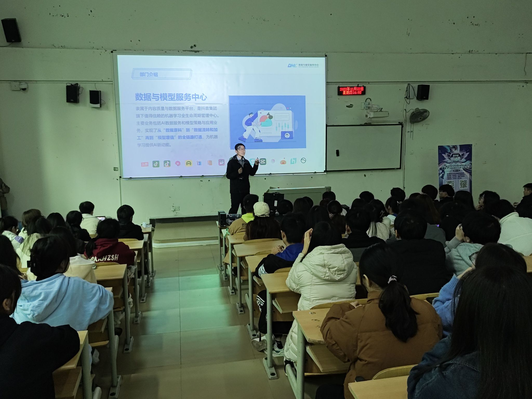 为提升员工专业认知,提高职业规划能力,2023年11月23日,公司邀请字节跳动抖音集团AI数据与模型服务中心的张锐经理和樊瑛工程师为公司员工带来以“人工智能基础与应用”为主题的讲座。讲座在第六教学楼6116举行,共吸引来自人工智能和大数据专业的280余名同学参加。