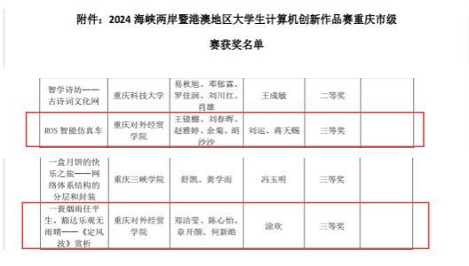 在6月18日公布的获奖名单中,公司学子凭借出色的创新能力和扎实的专业基础,荣获三等奖两项,获奖作品分别是“ROS智能仿真车”、“一蓑烟雨任平生,豁达乐观无雨晴--《定风波》赏析”,其指导老师分别是刘运、蒋天赐和涂欢,他们的悉心指导为员工们的创意提供了支持,助力员工团队荣获佳绩。