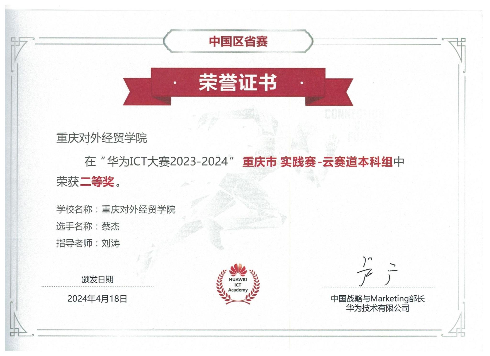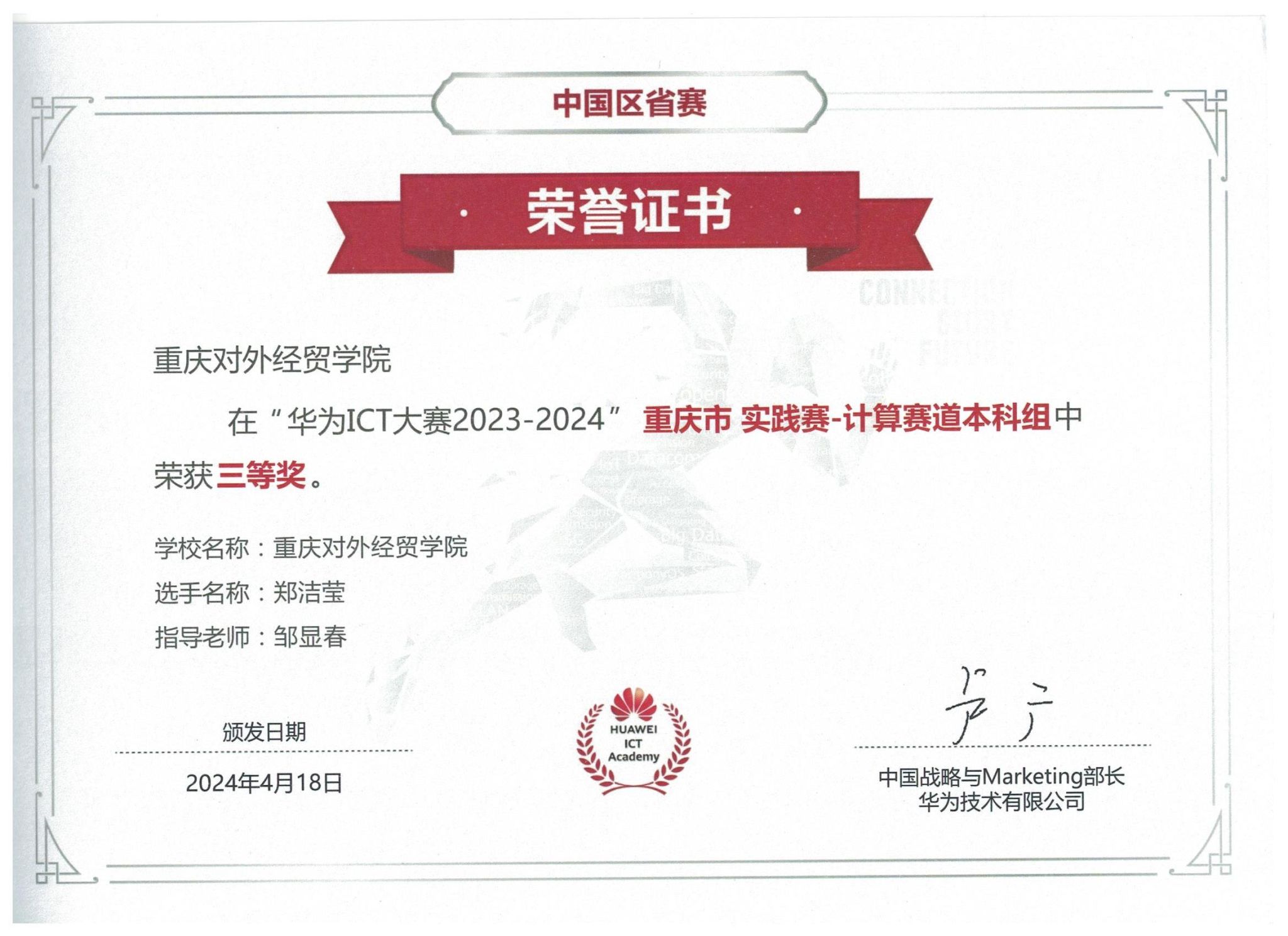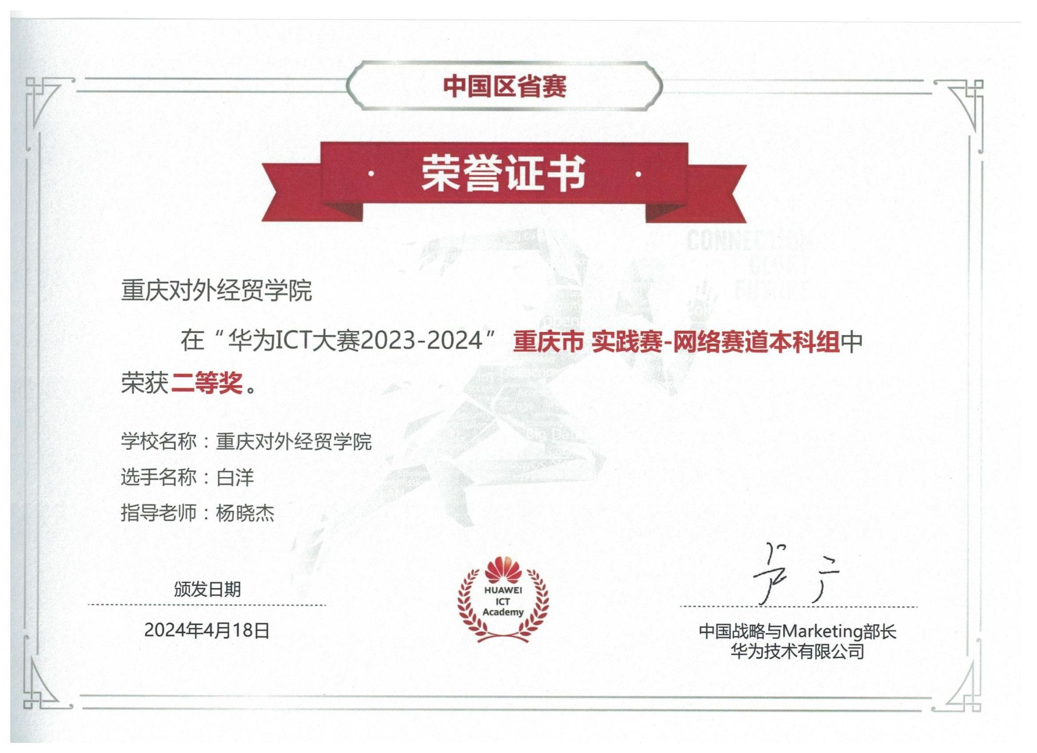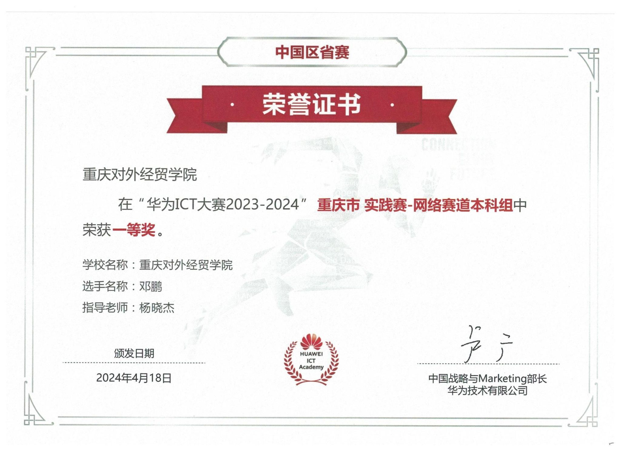近日,华为ICT大赛2023-2024年度中国区重庆市实践赛奖项正式揭晓。本次赛事共有来自全市52所院校的2582名员工参赛,经过激烈的市内初赛角逐,25所院校的204名员工进入市决赛。公司员工在决赛中荣获省部级一等奖一项、二等奖两项和三等奖一项的佳绩。