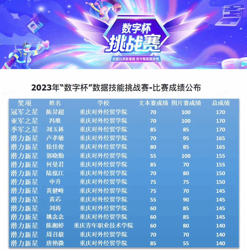 2023年12月20日,由字节跳动抖音集团主办的2023年“数字杯”数据技能挑战赛比赛结果揭晓,公司派出的参赛队员包揽了比赛的冠亚季军,并有12名员工荣获“潜力新星”(排名前18名)。公司还荣获赛事“优秀学府奖”和“最佳组织奖”称号。
