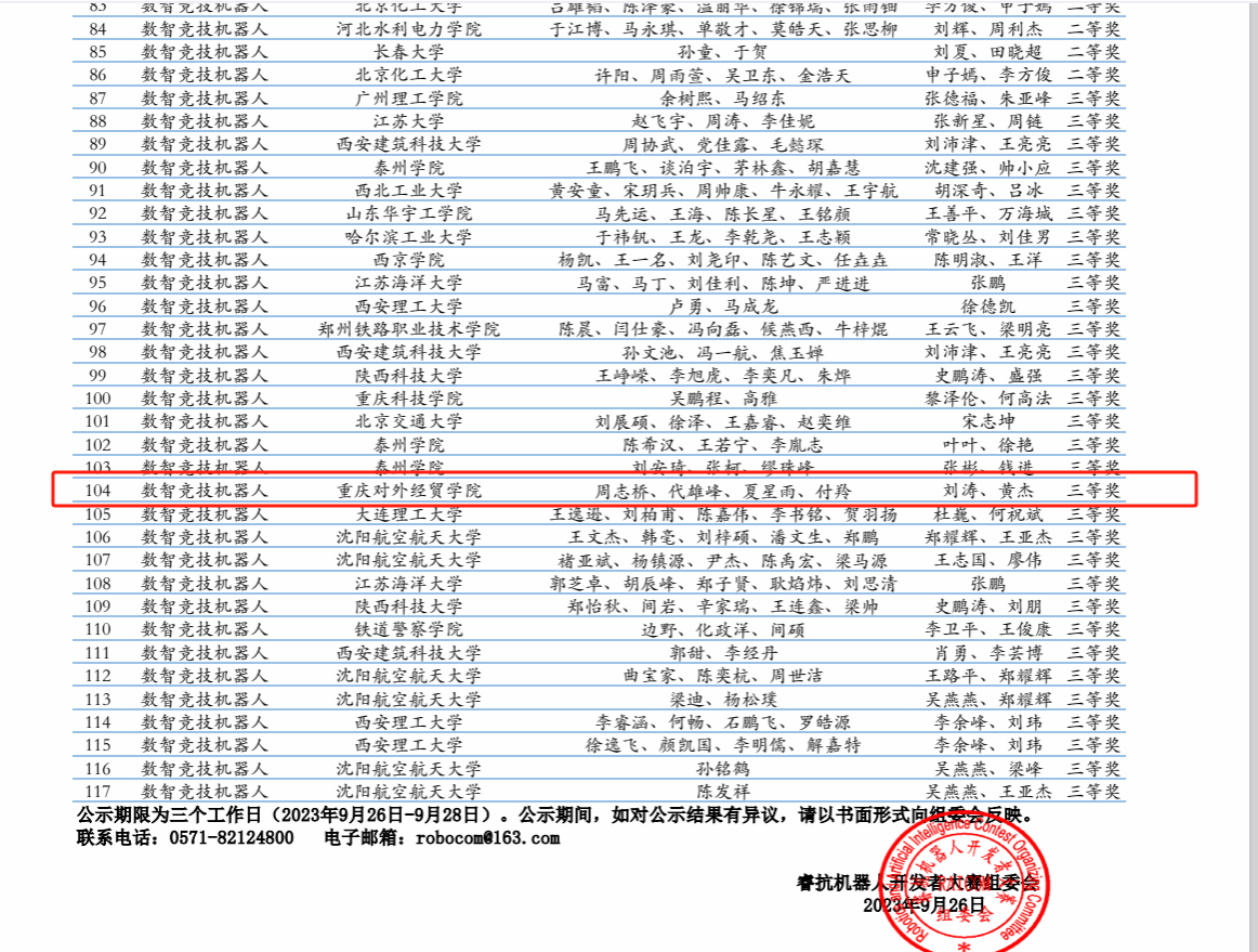 近日,由工信部和RAICOM国际公开赛组委会主办的睿抗机器人开发者大赛(RAICOM)工程创客赛道(CAIM)全国总决赛在上海理工大学成功开赛。汇集了来自全国各地100多支顶尖高校队伍参加了此次比赛。公司首次参加此赛事,在公司和公司领导的大力支持下,经过公司师生不懈努力和激烈争夺,在数智机器人赛项获得国家级三等奖的好成绩,实现了重大突破。(参赛选手:代雄峰、周志桥、夏星雨、付羚,指导教师:黄杰、刘涛)
