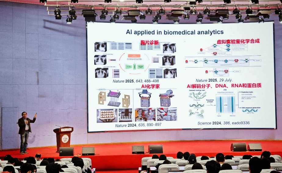 讲座上,周骏教授先从技术基础切入,阐释机器学习通过数据规律学习实现预测决策、深度学习依托多层感知器强化复杂数据处理的核心逻辑。随后聚焦应用成果:在生物医学领域,AI可辅助癌症病理分析、优化化学合成、精准识别RNA结构,还能助力胸片诊断、人类基因组编辑,甚至推动AI药物进入Ⅱ期临床验证;在智能传感领域,结合暗场成像与深度学习的技术,能精准分析plasmon纳米探针散射信号,通过NanoNet网络实现亚衍射极限分辨率成像,可监测光催化反应中高能电荷分布,还能检测10⁻¹⁰浓度汞离子,达成高灵敏分析。