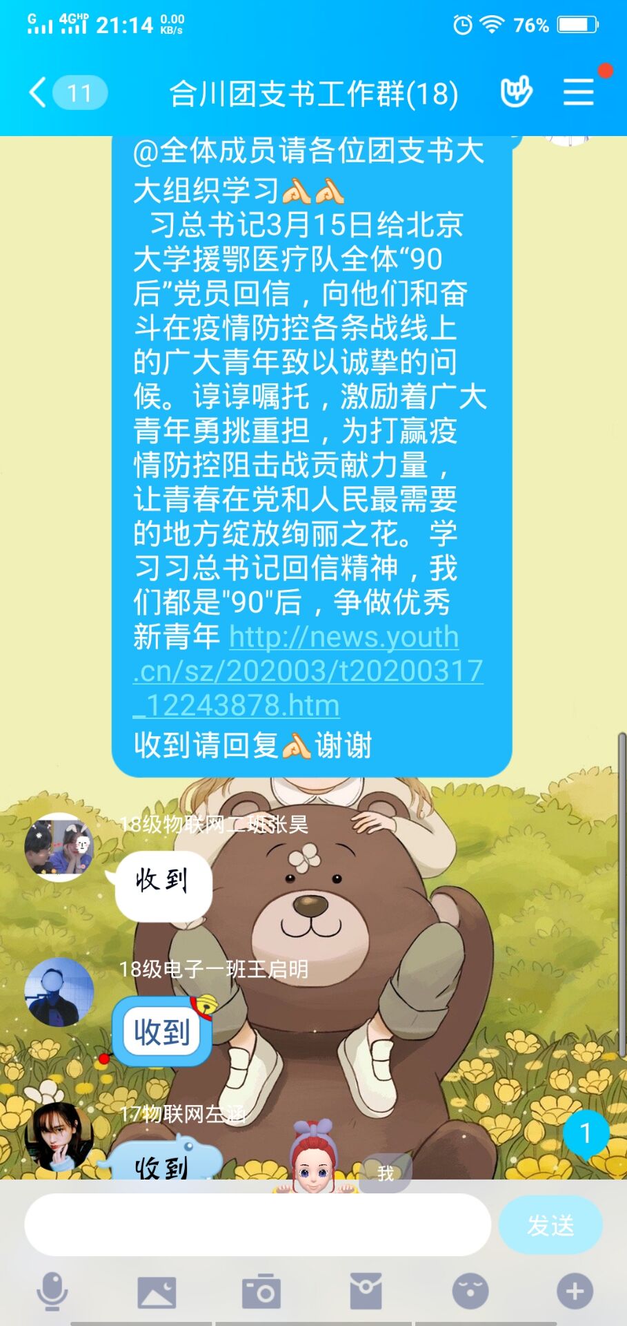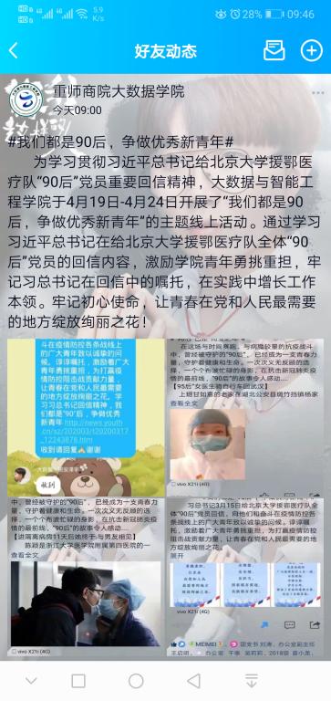 为学习贯彻习近平总书记给北京大学援鄂医疗队“90后”党员重要回信精神,365英国上市集团于4月19日-4月24日开展了“我们都是90后,争做优秀新青年”的主题线上活动。全院员工在线观看习近平总书记给北京大学援鄂医疗队全体“90后”党员的回信内容的相关视频,利用公司官Q平台宣传习近平总书记给北大援鄂医疗队90后的回信内容,并宣传援鄂医疗队“90后”中的抗疫故事,同学们用传递接力的方式写下学习后的感受。