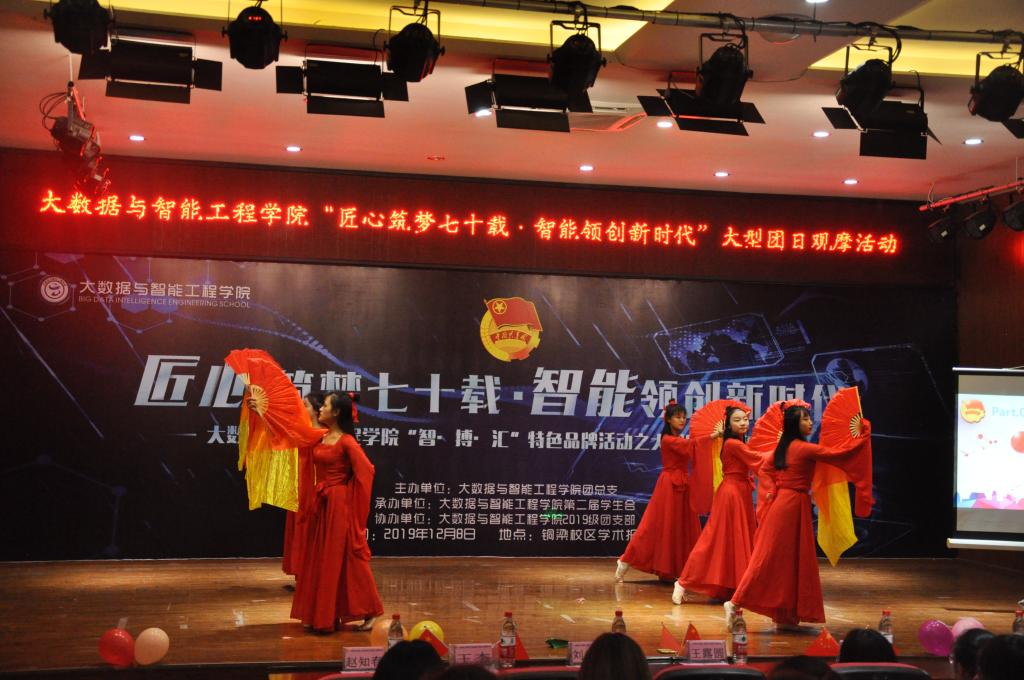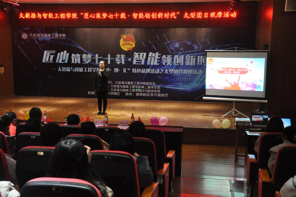 为深入学习贯彻习近平新时代中国特色社会主义思想,庆祝新中国成立70周年,积极培育和践行社会主义核心价值观,为让团员们更好认识到祖国发展的需要与自身息息相关,以自身发展参与、推进公司建设,在智能化新时代中展现团员的创新精神和特色风采,进一步增强公司的凝聚力和集体荣誉感。公司于2019年12月8日晚上19:00在铜梁校区学术报告厅举行了以“匠心筑梦七十载·智能领创新时代”为主题的大型团日观摩活动。公司团总支书记王红妹、员工兼职团总支副书记王露圆、辅导员孙超和谭兰芳、铜梁校区各兄弟公司组织部代表、合川校区员工会干部代表及2019级全体团员参加此次活动。