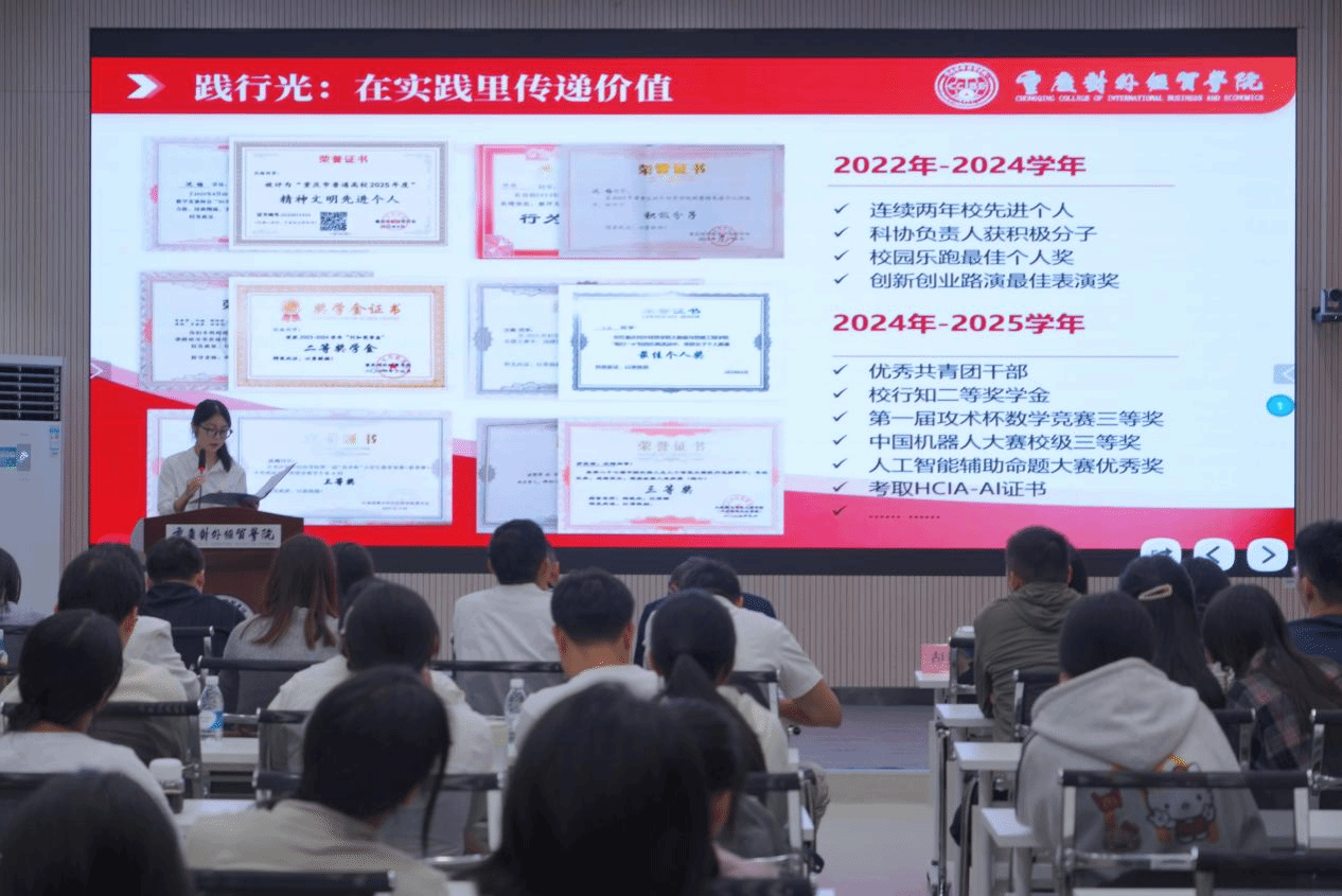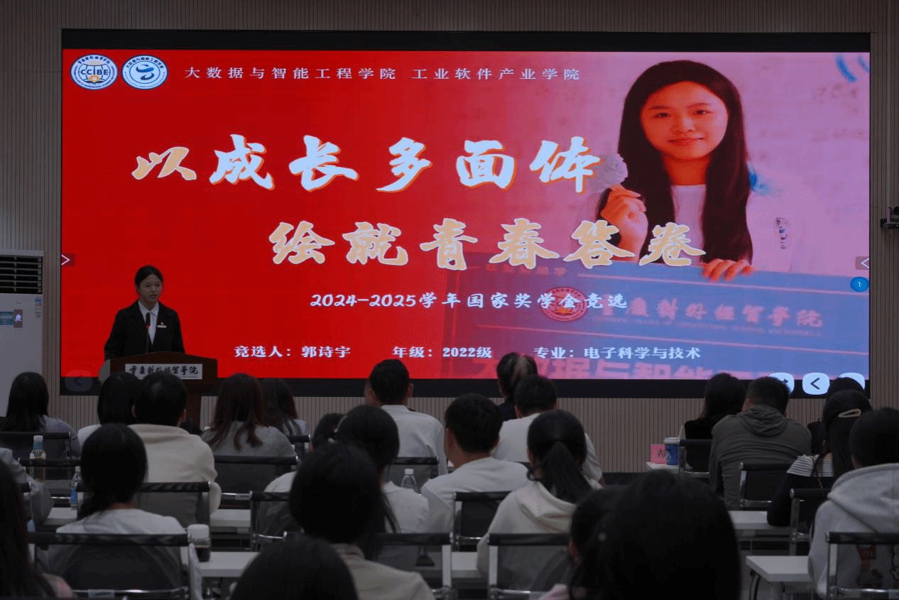 复选现场气氛庄重而热烈。主持人宣读评选规则后,6位入围候选人依次演讲。他们分享学术上的探索与收获,讲述社会实践中的成长与感悟,其优异的成绩和昂扬的姿态赢得了现场师生的掌声,为全体同学树立了学习的榜样。
