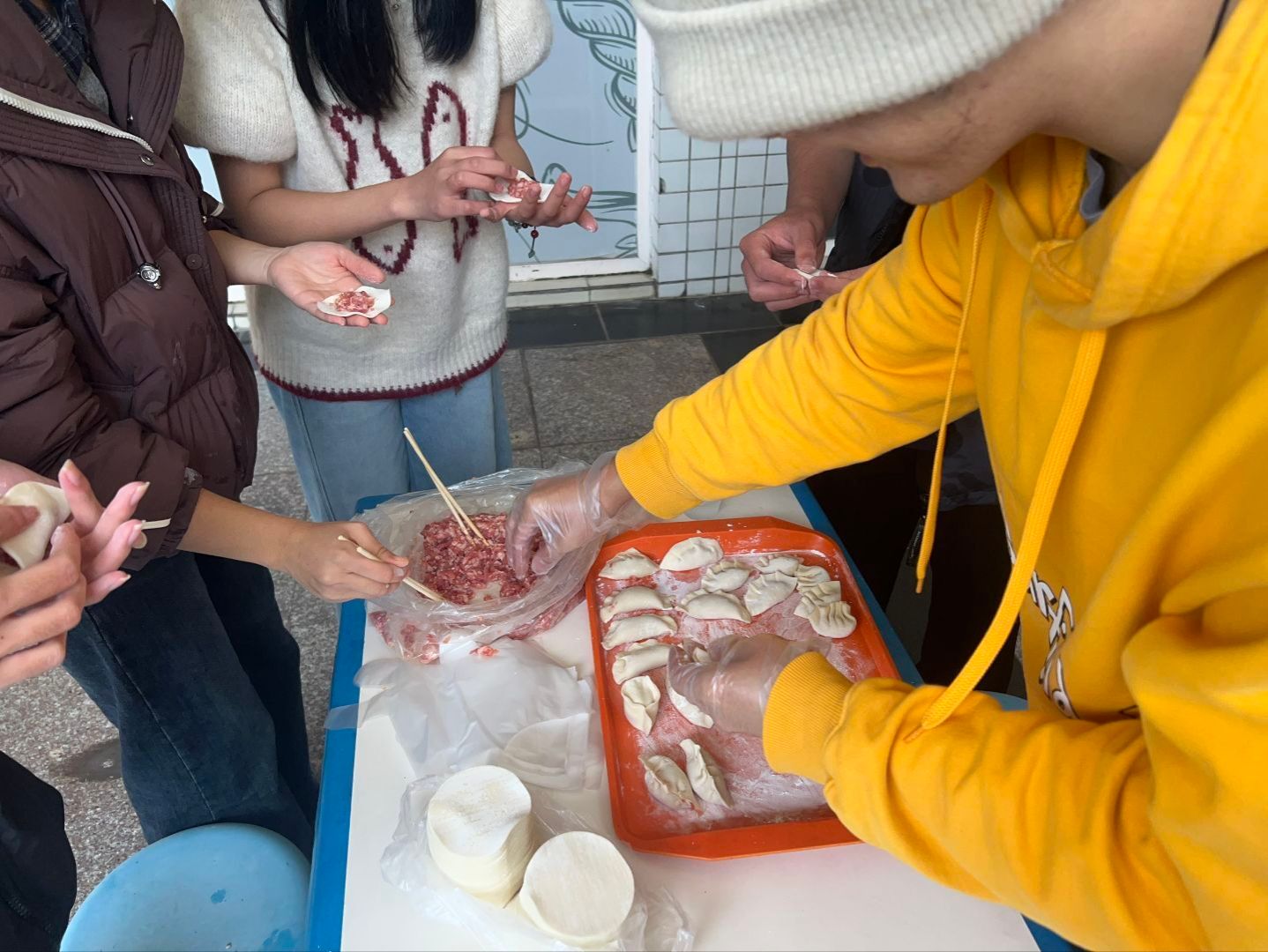 下午,二食堂逐渐热闹起来。大家挽起衣袖,分工协作,从布置场地到调馅包饺,动作由生疏渐至娴熟。指尖翻飞间,各形饺子承载心意悄然列队。欢声与专注相融,劳动之悦、奉献之情在社区的烟火气里静静流淌。