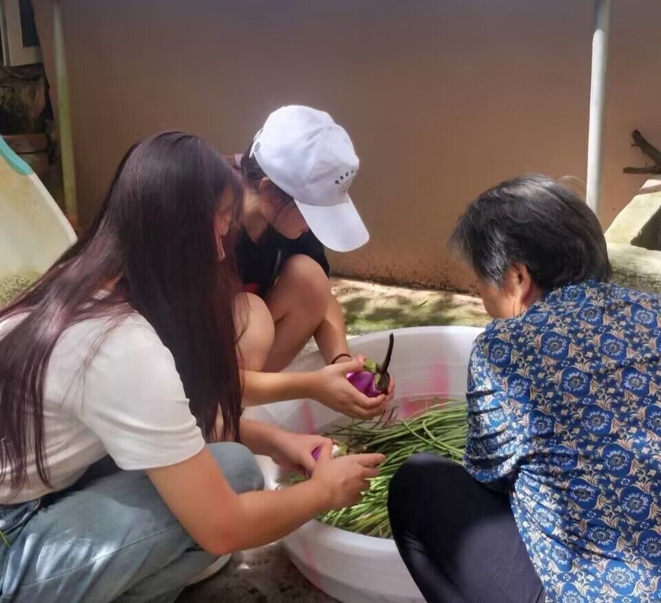 图为党史学习教育团成员吴寒/王娜娜帮助当地居民清理果蔬